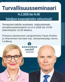 Kaikille avoin, maksuton turvallisuusseminaari lauantaina 14.2.2026 klo 14 (kahvitarjoilu 13.30 alkaen) Seinäjoen kaupungintalon valtuustosali. Puhujina ovat eduskunnan varapuhemies Paula Risikko ja…